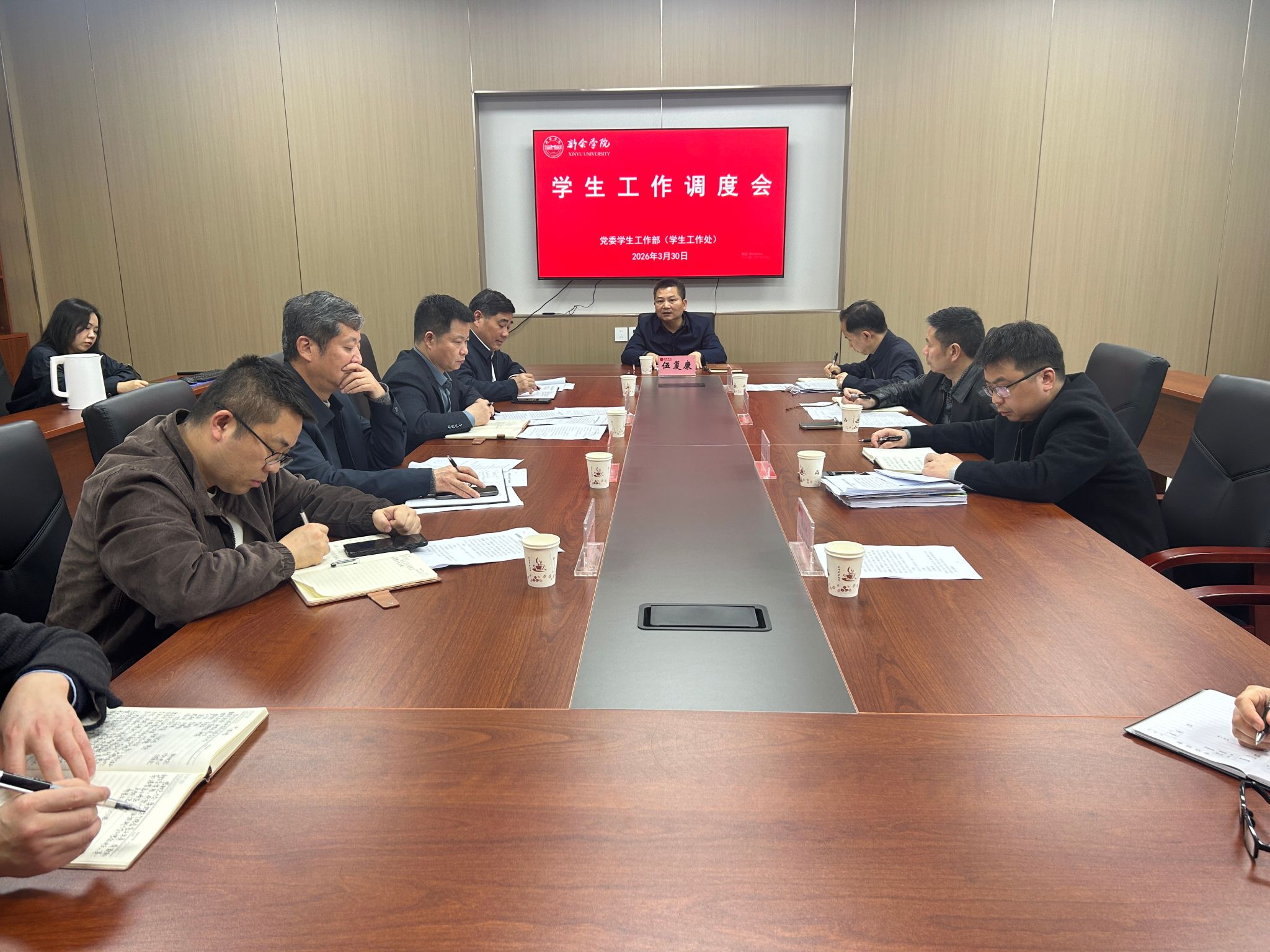 3月30日,我校召开学生工作调度会。校党委书记伍复康出席会议并讲话。校党委委员、副校长周小云,校党委委员、宣传部部长钟钺参加会议。教务处、招就处、保卫处、学工处、团委、体育学院等相关单位负责人参会。